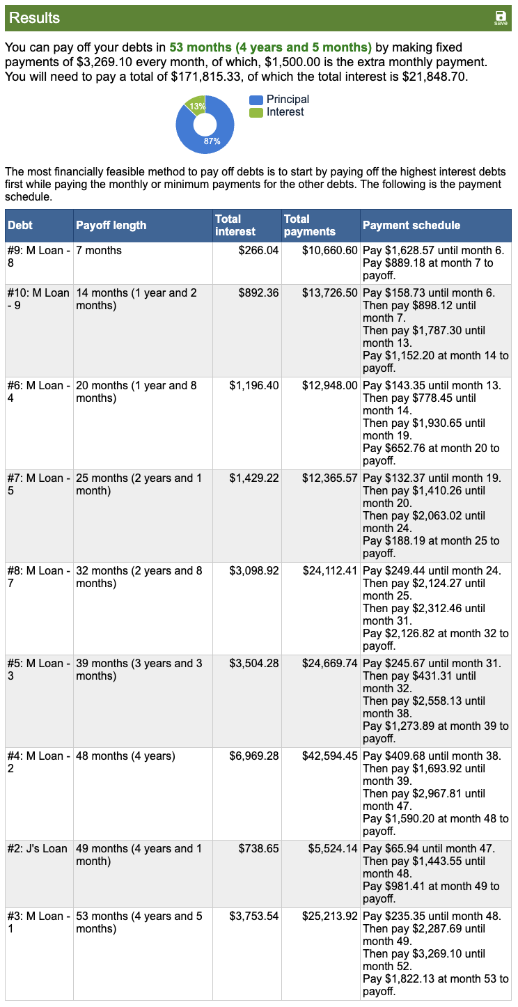 After discussing our options, my husband and I decided to start with $1,500/month extra payments and adjust as needed. Using the Debt Payoff Calculator, I transferred the plan into a spreadsheet that tracks our monthly goals and shows exactly when each loan will be paid off.