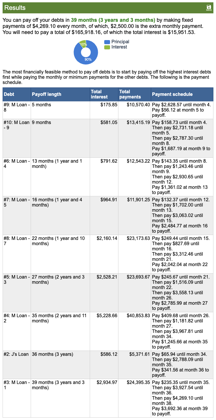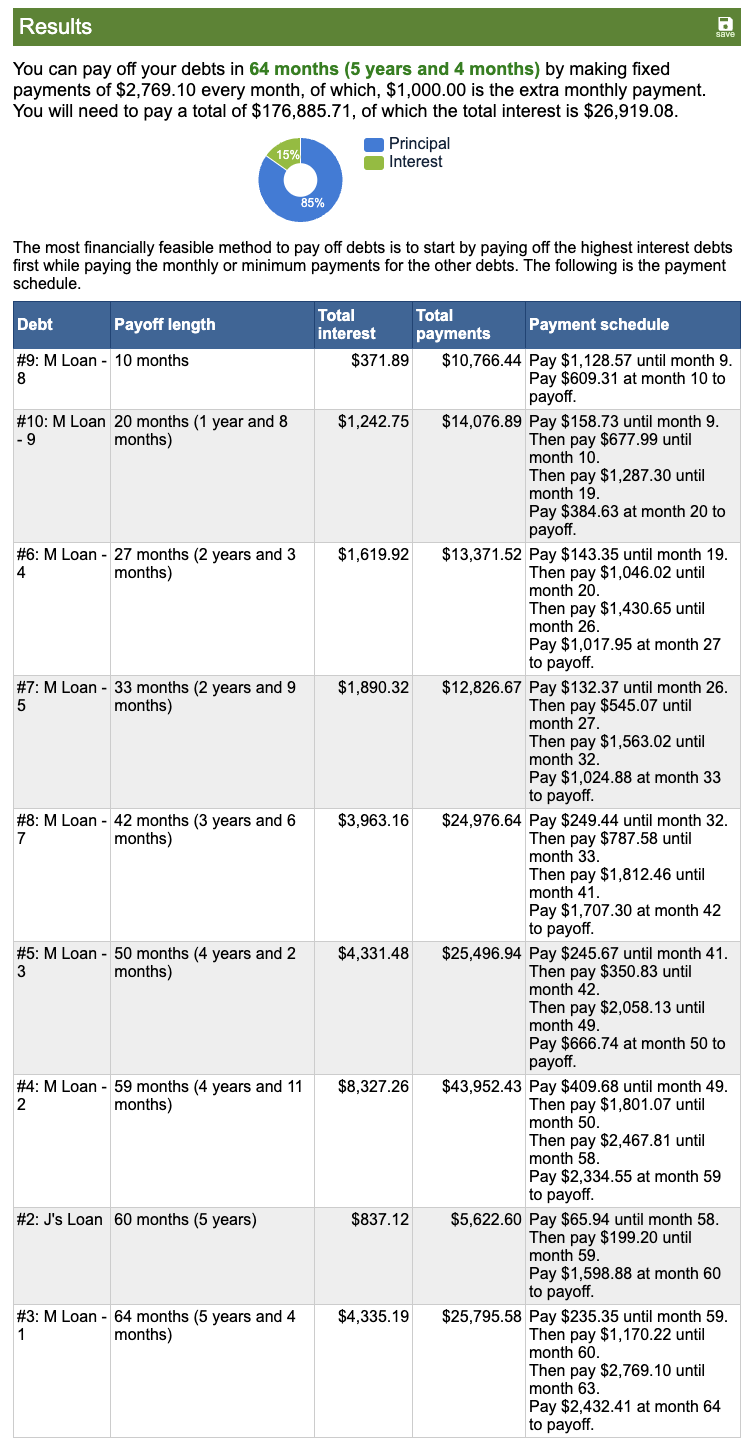 Using a debt avalanche strategy, it generates a payoff plan that you can then adjust to meet your desired goal. I’ll walk you through how my husband and I set ours up and fine-tuned our plan.